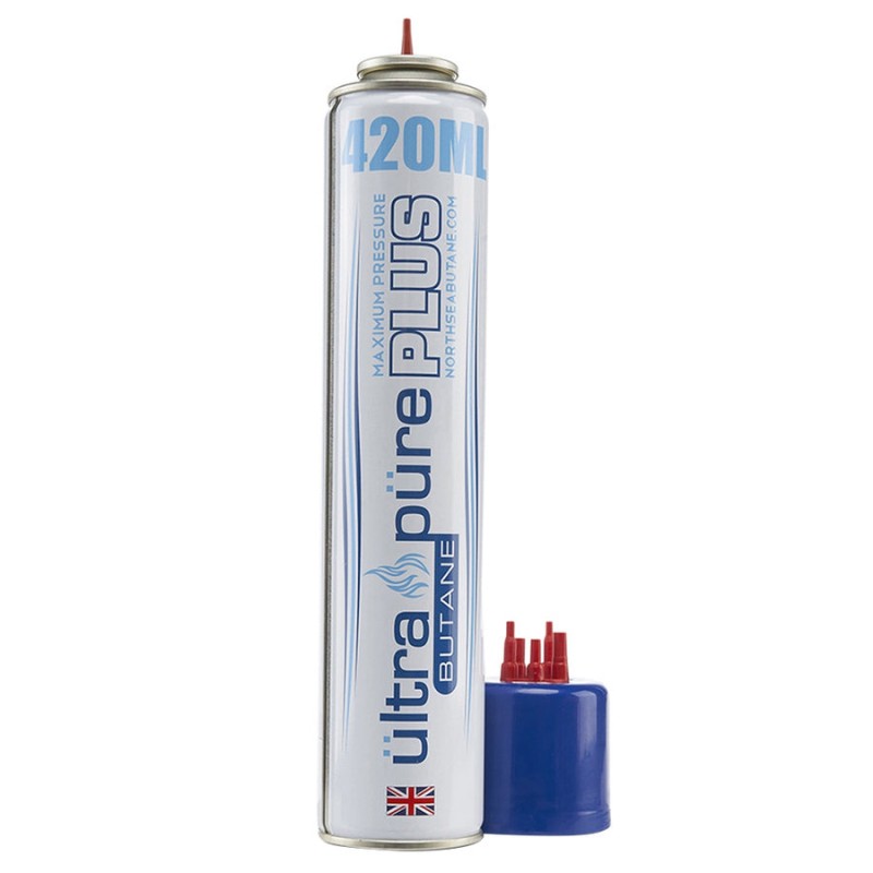 These 420ml bottles of Ultra Pure butane are 30% larger than the 300ml bottles. Ultra Pure butane is 99.995% pure with near zero impurities. Each cap contains various adapters that makes it compatible with virtually every lighter. These cans are filled with premium European butane gas for use with refillable lighters.